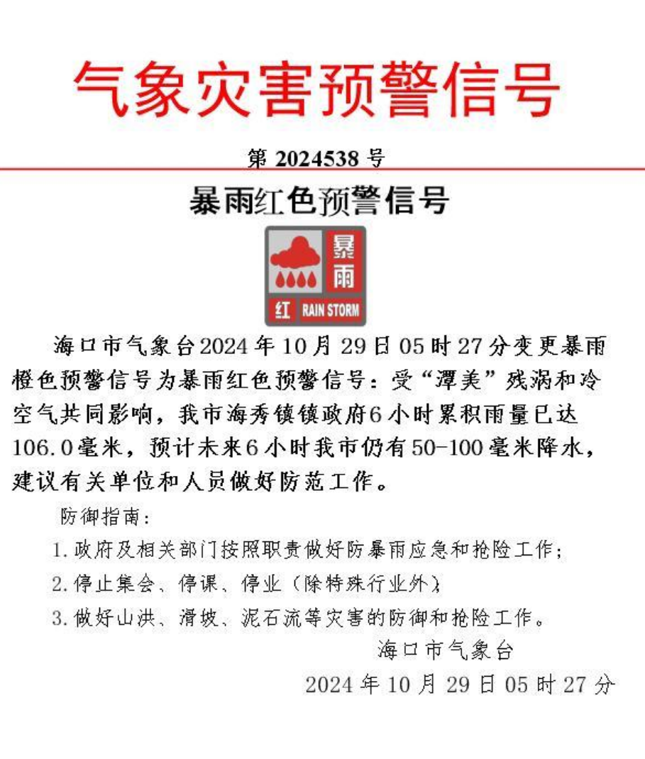 海口發佈暴雨紅色預警!學生可延時至9時到校