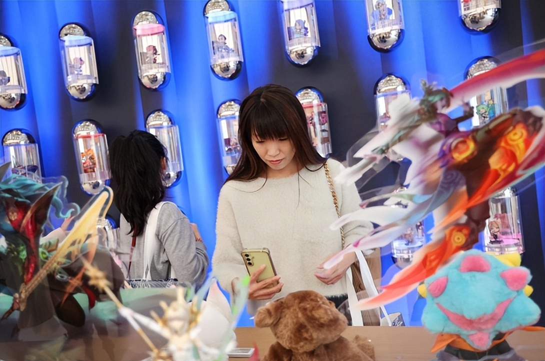 店內二樓左手邊的遊戲手辦區讓台灣青年眼前一亮:一整面牆陳列着英雄聯盟系列手辦,亞索、莎彌拉等熱門遊戲角色的卡通手辦被放置在一粒粒透明的膠囊空間內,吸引了台灣青年打卡拍照。