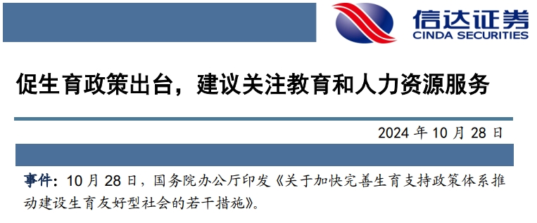 針對上述措施的出台,信達證券發佈研究報告認為,政策旨在完善生育支持政策體系和激勵機制,為推動實現適度生育水平、促進人口高質量發展提供有力支撐,有望推動出生率的提高進而帶動教育需求的提升,同時有望推動用人單位靈活用工滲透率的提高。