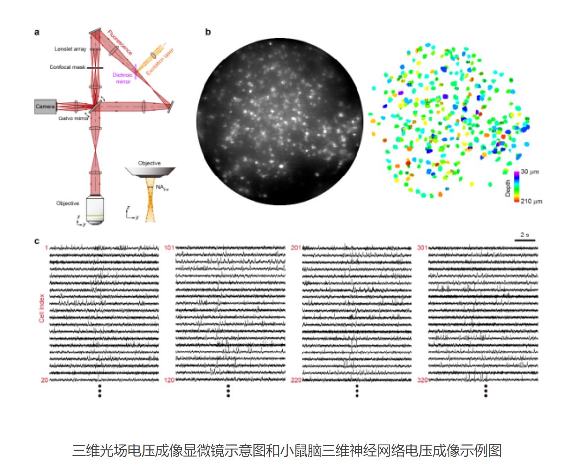 據悉,該團隊於近日在《自然-方法》(Nature Methods)上,在線發表了題為“Volumetric Voltage Imaging of Neuronal Populations in Mouse Brain by Confocal Light Field Microscope”的研究論文。該研究開發了新型三維光場顯微成像技術,提升了神經元電壓光學成像的通量。這一技術能夠對小鼠腦三維神經網絡中數百神經元的膜電位進行高速同步記錄,為解析神經網絡的信息處理機制提供了新工具。