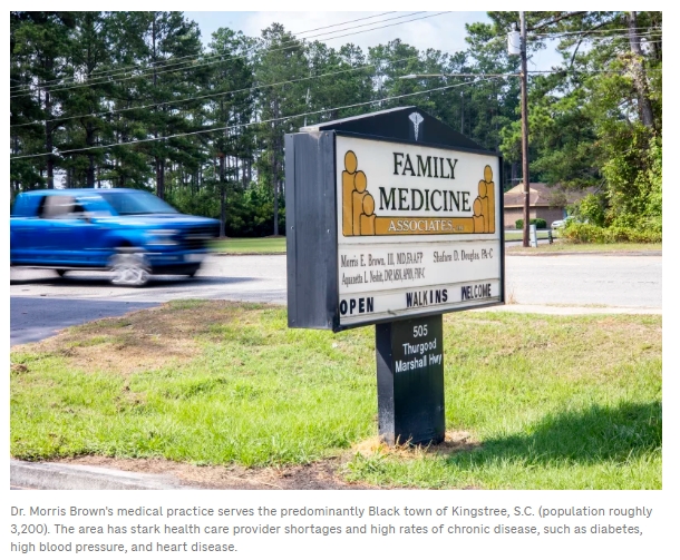 莫里斯·布朗的診所主要服務以非裔為主、約3200人口的南卡羅來納州金斯特里小鎮,該地區醫療服務嚴重短缺且慢性病發病率高。(報道截圖)