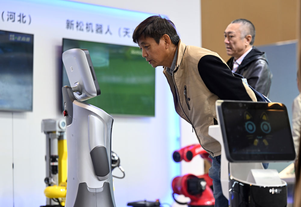 10月25日,在2024京津冀產業鏈供應鏈大會開幕式會場外設置的企業推介展區,與會嘉賓與一款服務機器人互動。新華社記者 趙子碩 攝