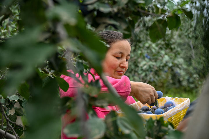 農民在新疆崑玉市老兵鎮一家種植園內採摘新西梅(9月4日攝)。新華社記者 陳朔 攝