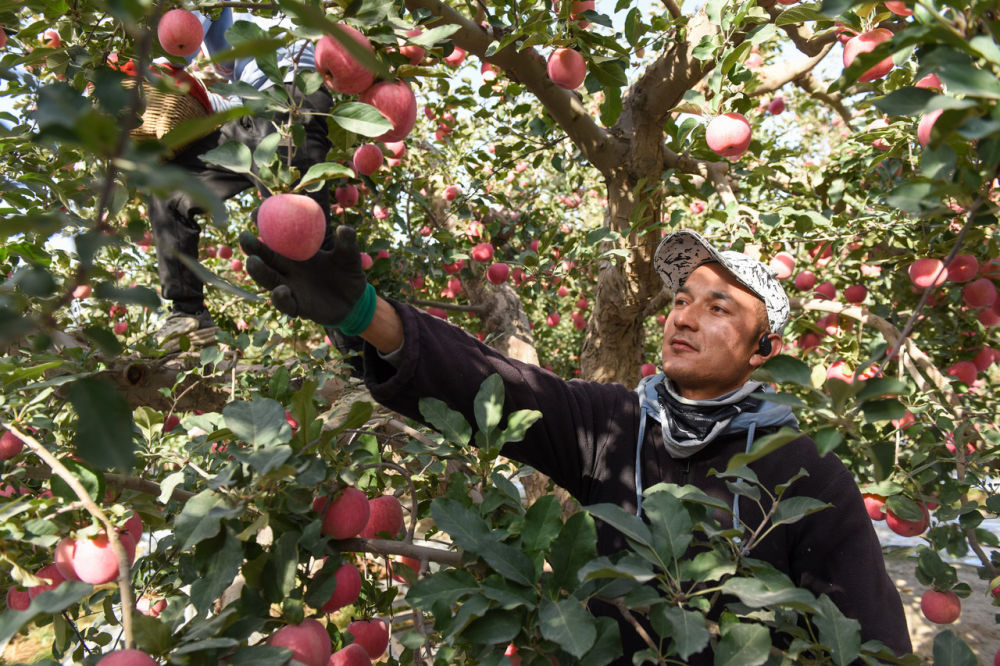 10月23日,在新疆阿克蘇地區紅旗坡農場,果農在採摘蘋果。新華社記者 高晗 攝