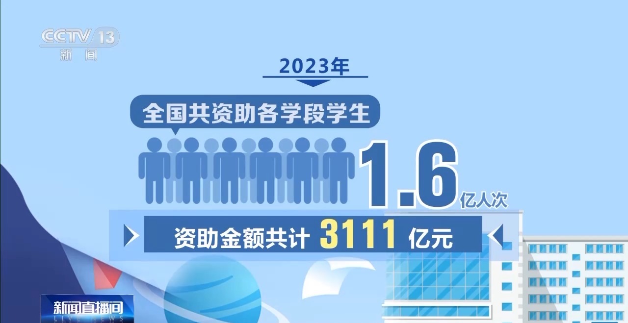 數據顯示,2023年,全國共資助各學段學生1.6億人次,資助金額共計3111億元。其中,全國財政投入2161億元,約佔資助總金額的69%。
