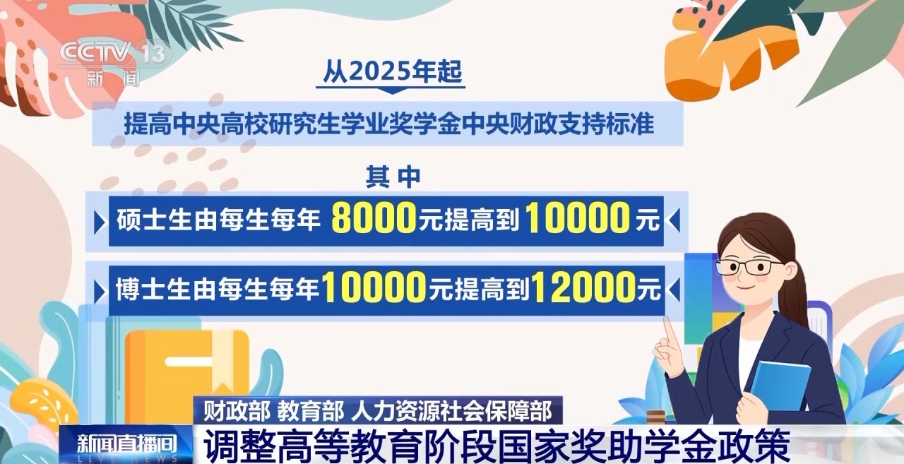 與此同時,提高研究生學業獎學金支持標準。從2025年起,提高中央高校研究生學業獎學金中央財政支持標準,其中: