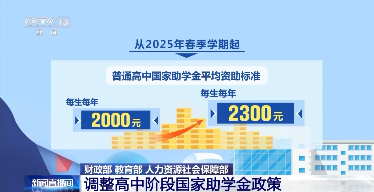 此次政策調整也涉及高中階段學生資助政策。首先,提高普通高中國家助學金資助標準。從2025年春季學期起,將普通高中國家助學金平均資助標準由每生每年2000元提高到2300元。