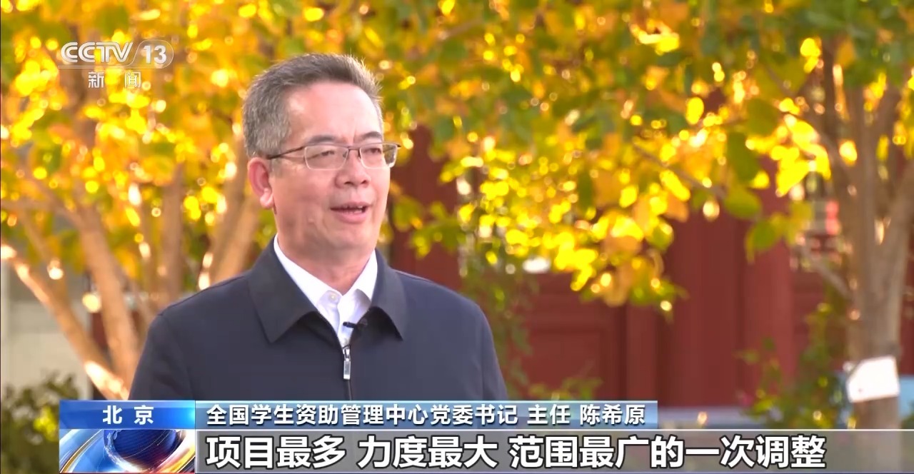 *全國學生資助管理中心黨委書記 主任 陳希原:*這次政策調整統籌兼顧了助困和獎優、提標和擴面、高等教育階段和高中階段。這是2007年資助政策體系建立以來,項目最多、力度最大、範圍最廣的一次調整。
