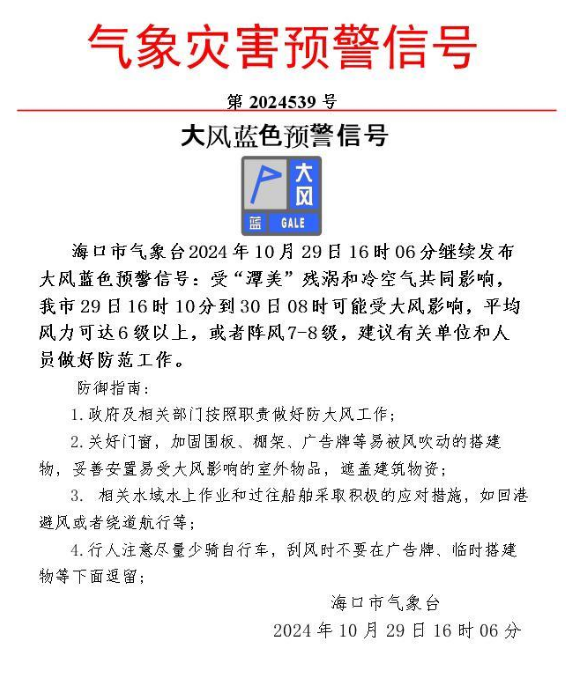 *29日,*北部灣海面和本島西部海面,風力6~7級、陣風8~9級;本島東部和南部海面,西沙、中沙和南沙羣島附近海面,風力6~7級、陣風8級。