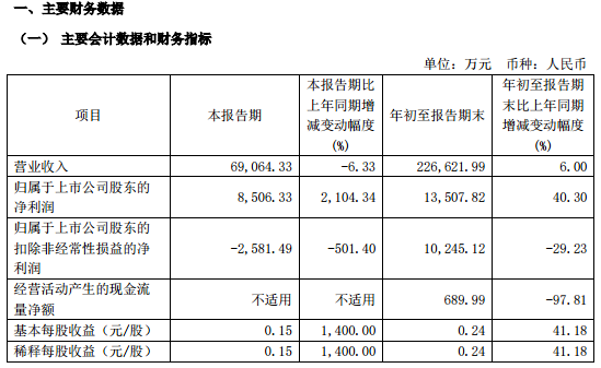 *【環球網消費報道 記者 文馨】*服裝企業九牧王(601566)公佈的2024年三季報顯示,公司實現營業收入22.66億元,同比增長6.00%;實現淨利潤1.35億元,同比增長40.30%。第三季度實現淨利潤8506.33萬元,同比增長2104.34%。報告期內,公司投資業務公允價值變動損失減少。