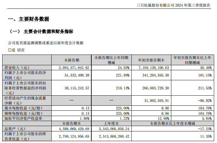 *【環球網消費報道 記者 文馨】*三隻松鼠(300783)10月29日公佈了2024年三季度財報,業績表現亮眼。得益於“高端性價比”戰略的深入實施,公司前三季度實現營收71.69億元,同比增長56.46%;實現淨利潤3.41億元,同比增長101.15%;扣非後淨利潤為2.67億元,同比大增211.55%。