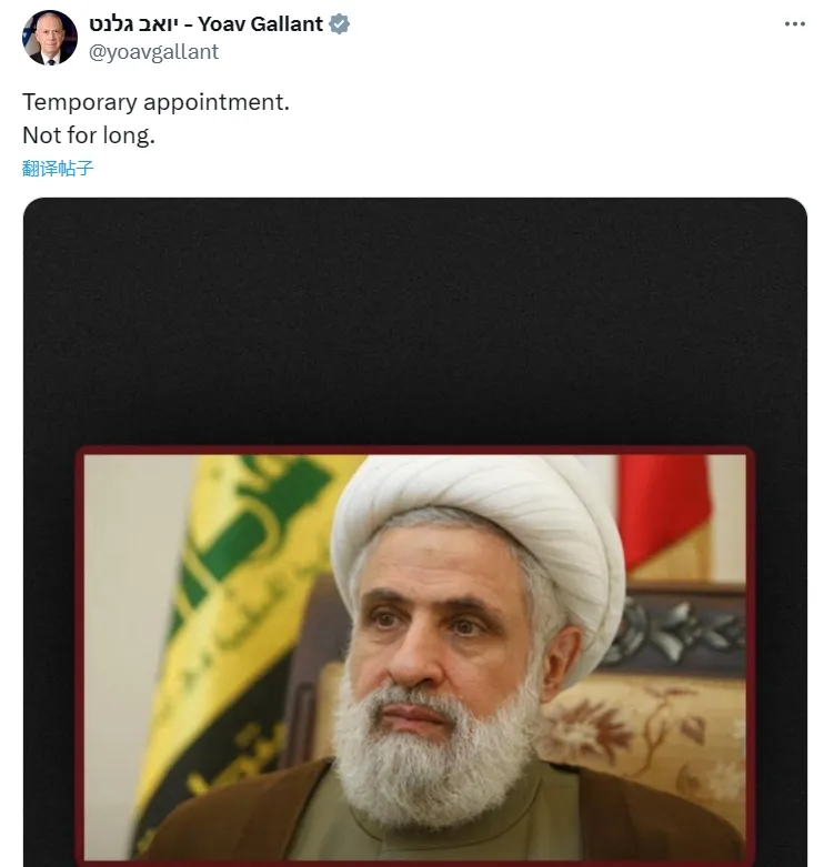 當地時間10月29日,以色列國防部長加蘭特在社交媒體發文,附上了黎巴嫩真主黨新領導人納伊姆·卡西姆的照片,加蘭特在推文中向對方發出死亡威脅,稱:“暫時任命。不會太久。”