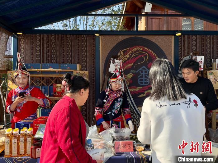 圖為黃予心(中)在江西吉安金坪民族鄉八寨集市售賣畲族特產。中新網記者劉子衿 攝