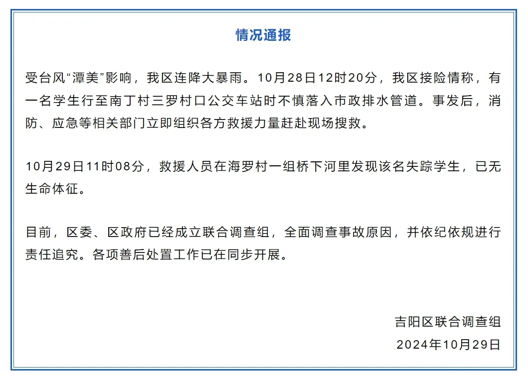 10月28日,三亞市吉陽區接險情稱,有一名學生行至南丁村三羅村口公交車站時不慎落入市政排水管道。29日,救援人員在海羅村一組橋下河裏發現該名失蹤學生,已無生命體徵。
