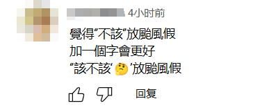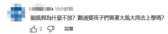 陳揮文關於不該放假的言論引起了島內網友熱議。有網友在該網絡節目發佈平台YouTube評論區稱,“颱風假為什麼不放?難道要孩子們冒着大風大雨去上學嗎?”“覺得‘不該’放颱風假,加一個字會更好,‘該不該’放颱風假”。