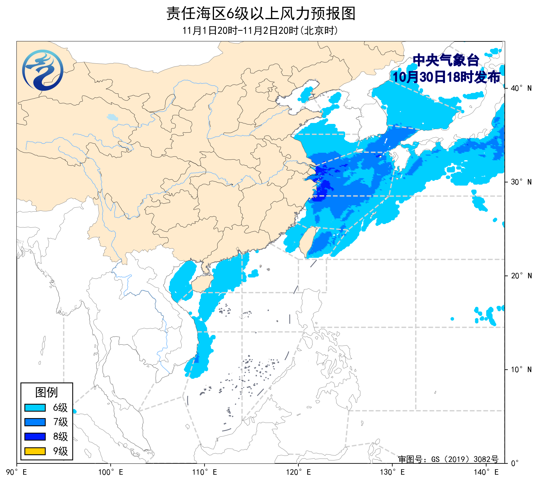 預計,11月2日夜間至6日白天,渤海、渤海海峽、黃海大部海域、東海大部海域、台灣海峽、台灣以東洋麪、巴士海峽、北部灣、瓊州海峽、南海北部和中部海域將有6~8級、陣風9級的風。