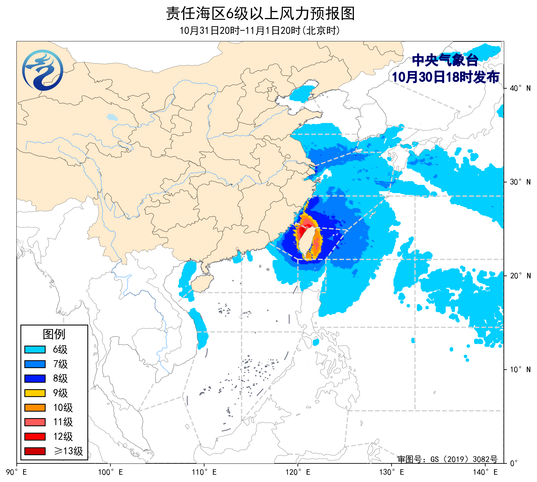 10月31日20時至11月1日20時,台灣海峽將有10~11級、陣風12~13級減弱到7~8級、陣風9級的偏北轉西南風,東海南部海域將有8~10級、陣風11級的偏東轉偏南風,台灣以東洋麪將有9~10級、陣風11級減弱到7~8級、陣風9級的偏南風,黃海南部海域將有6~8級、陣風9級的東北風,巴士海峽將有7~8級、陣風9級減弱到5~6級、陣風7級的西南風,東海北部海域將有6~7級、陣風8級的偏東到東北風,南海東北部海域將有5~7級、陣風8級的偏西到西南風,北部灣、南海中西部海域將有4~6級、陣風7級的偏北到西北風,渤海、黃海中部海域將有4~6級、陣風7級的偏北到東北風。