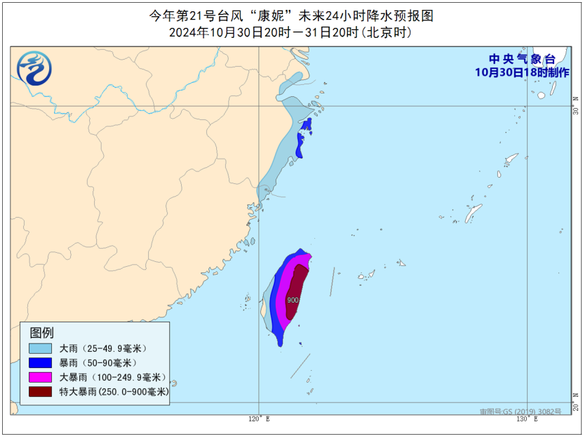 *降水預報:*30日20時至31日20時,浙江東部、福建東北部等地部分地區有大到暴雨,台灣島大部有暴雨或大暴雨,其中台灣島東部部分地區有特大暴雨(250-900毫米)。
