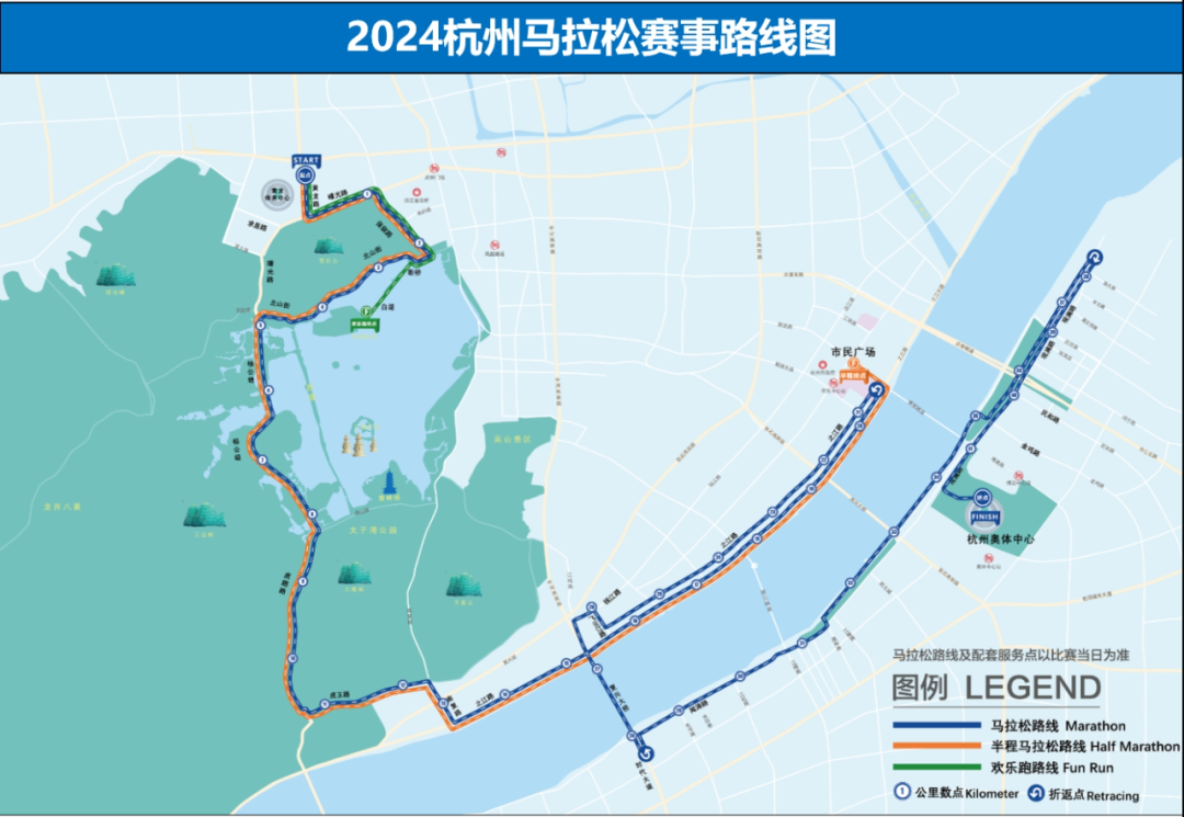 經市人民政府批准,2024杭州馬拉松賽定於11月3日(週日)舉行。屆時,將有3.6萬名運動員和愛好者分別參加全程馬拉松、半程馬拉松、歡樂跑等多個項目。其中,起點設在西湖區黃龍體育中心及黃龍路,全程馬拉松比賽終點設在濱江區奧體中心主體育場,半程馬拉松終點設在上城區波浪文化公園,歡樂跑終點設在西湖風景名勝區孤山路平湖秋月。