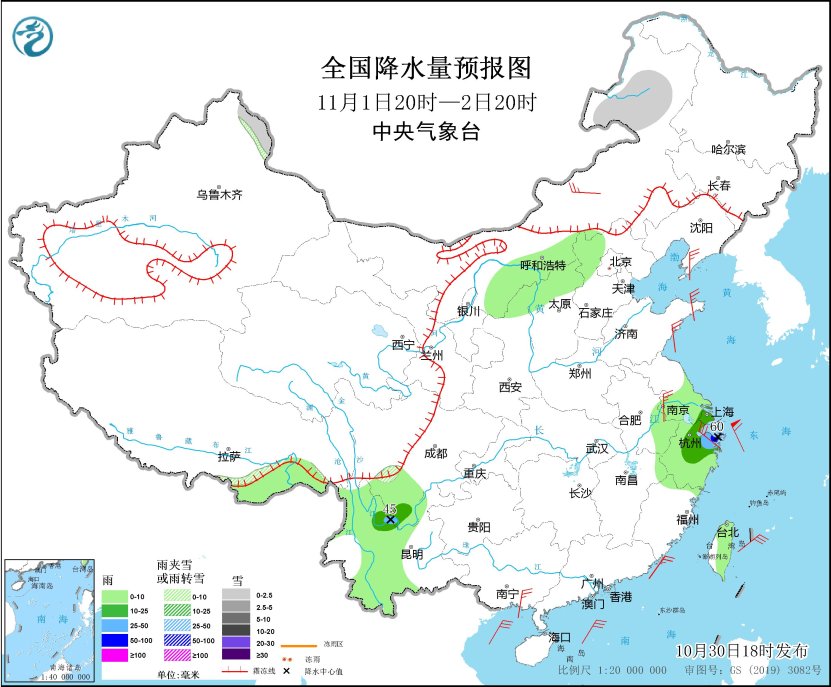 *11月1日20時至2日20時,*新疆北疆北部山區、內蒙古東北部等地部分地區有小雪或雨夾雪。江蘇東南部、上海、浙江中北部、四川南部、雲南北部等地部分地區有中到大雨,其中,浙江東北部部分地區有暴雨(50~60毫米)。內蒙古中部、遼東半島、山東半島、江蘇南部、浙江東部、廣西南部沿海等地部分地區有4~6級風;黃海南部、東海南部、台灣以東洋麪等海域有7~8級、陣風9級的大風(見圖5)。
