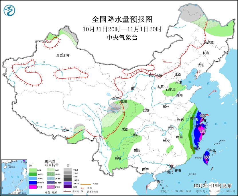 *10月30日20時至31日20時,*內蒙古東北部、黑龍江西北部、新疆北疆北部、青海東部和中西部、甘肅中西部和西南部、川西高原北部、西藏東部等地部分地區有小到中雪或雨夾雪,其中,新疆北疆北部局部地區有大雪(5~7毫米)。浙江東部、福建東北部等地部分地區有大到暴雨,台灣島大部有暴雨或大暴雨,其中台灣島東部部分地區特大暴雨(250~900毫米)。遼東半島、西藏北部、安徽中部、江蘇南部、浙江、廣東東南部沿海等地部分地區有4~6級風(見圖3)。