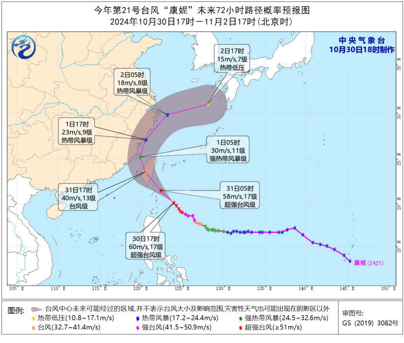 圖1 今年第21號颱風“康妮”未來72小時路徑概率預報圖(10月30日17時-11月2日17時)