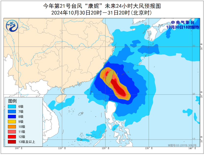 圖2 今年第21號颱風“康妮”未來24小時大風預報圖(10月30日20時-31日20時)