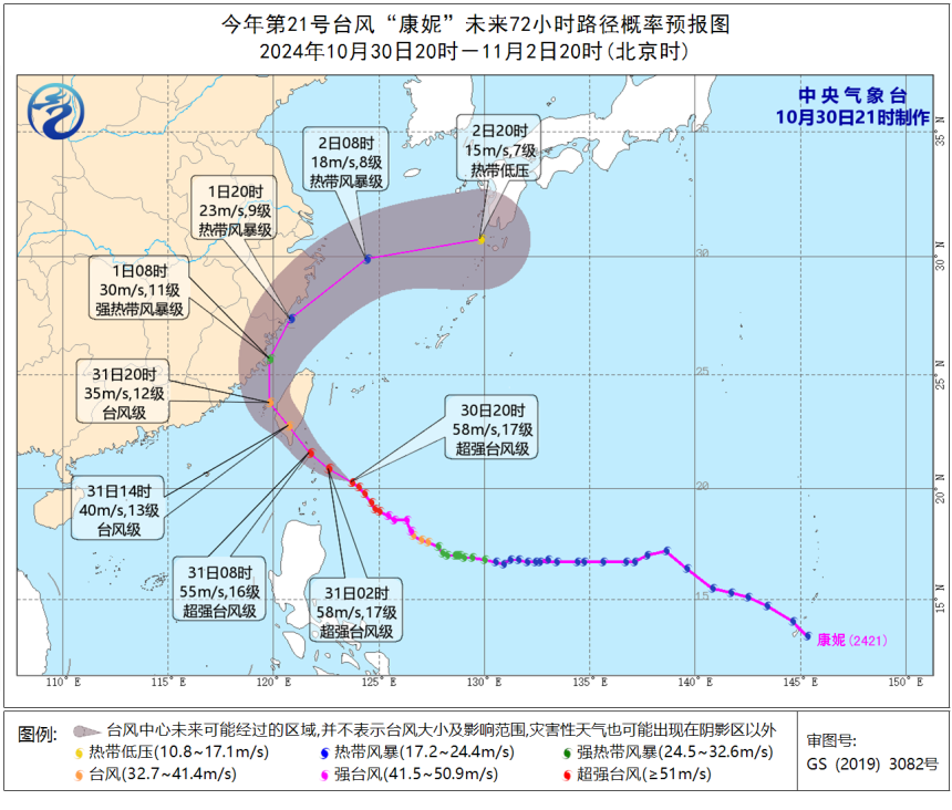 今年第21號颱風“康妮”(超強颱風級)的中心今天(30日)下午5點位於台灣省台東市東南方向約420公里的西北太平洋洋麪上,就是北緯20.1度、東經124.0度,中心附近最大風力有17級(60米/秒),中心最低氣壓為920百帕,七級風圈半徑380~480公里,十級風圈半徑180~200公里,十二級風圈半徑110公里。