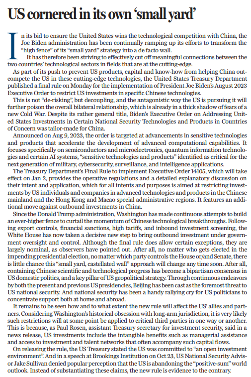 此前,外界普遍認為美國正在放棄“正和”的世界觀。10月23日,美國總統國家安全事務助理沙利文在布魯金斯學會上發言時否認了這一説法。隨後,美國財政部在發佈最終規則時也表示,美國致力於建設“開放的投資環境”。然而,最終規則的發佈,終究讓美國的“言”與“行”背道而馳。