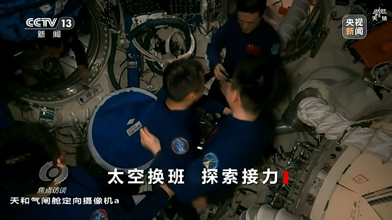 重返中國空間站的神十九航天員蔡旭哲打開艙門,再次體驗失重,他輕鬆地就從飛船進入空間站節點艙,和等待他們到來的神十八乘組來了一個大擁抱。第一次進入空間站的兩位“90後”航天員也同樣受到了熱烈的歡迎。在打掃一新的空間站核心艙,歡迎儀式必不可少。