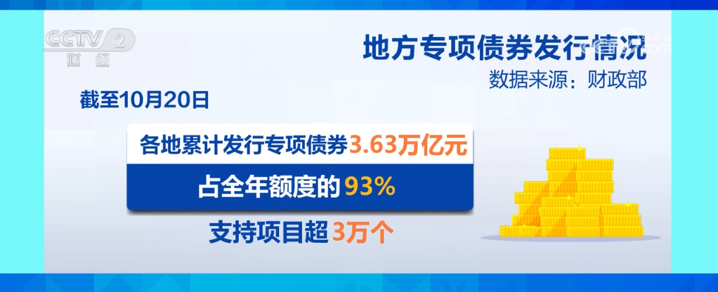 數據顯示,9月份,全國一般公共預算支出、政府性基金預算支出同比分別增長5.2%和34.2%。同時,地方專項債券發行加速,9月發行約佔全年額度的26%。截至10月20日,各地累計發行專項債券3.63萬億元,佔全年額度的93%,支持項目超3萬個。