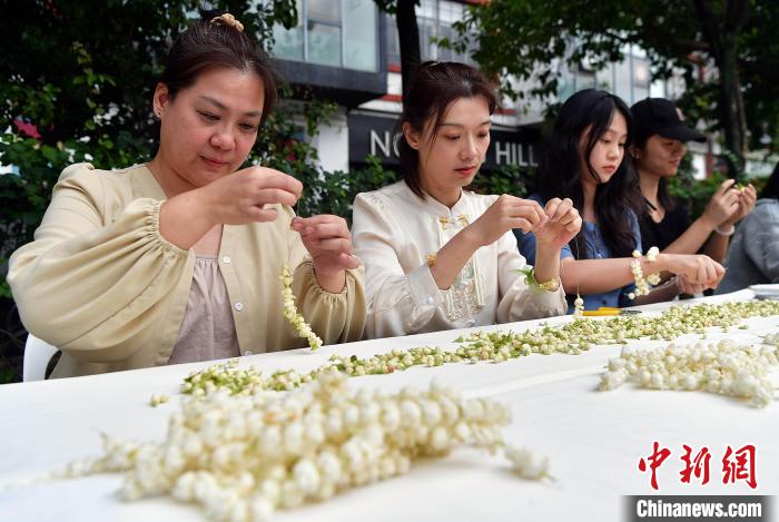 鄒曉娜在現場進行茉莉花手環製作。她表示,茉莉花是福州的市花,和兩岸朋友一起製作茉莉花手環,很有意義,而且能讓大家對福州有更深入的認識。