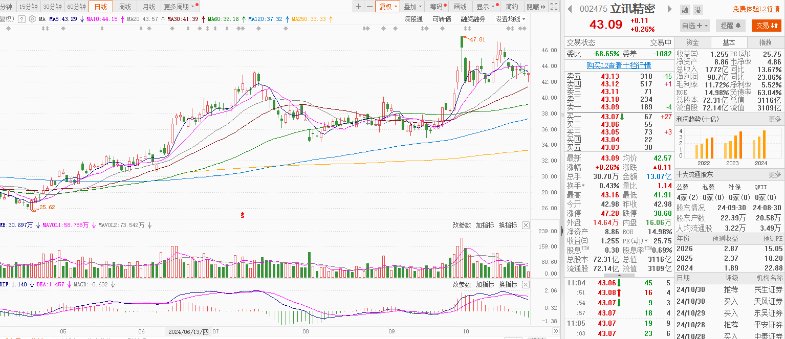 立訊精密董事長在會上介紹了2024年第三季度的經營情況,並指出公司各個業務板塊的推進都非常順利。數據顯示,立訊精密前三季度實現營業收入約1771.77億元,同比增長13.67%;歸母淨利潤約90.75億元,同比增長23.06%。其中,第三季度營收735.79億元,同比增長27.07%,淨利潤36.79億元,同比增長21.88%。