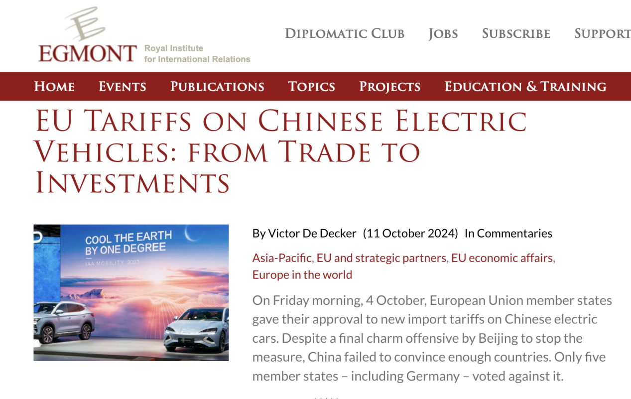 △德德克10月11日文章《歐盟對中國電動汽車的關税:從貿易到投資》截圖
