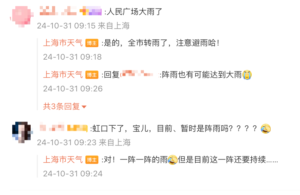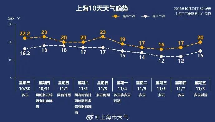 受颱風“康妮”影響,預計強降水將持續到11月2日(週六)凌晨,集中降水時段出現在今天半夜到週五白天。今天夜裏起上海市風力逐漸增大,*週六開始風力逐漸減弱。*伴隨此次風雨過程,週五和週六氣温下降,最高氣温僅20℃。*週日申城天氣恢復平靜,氣温回升,最高氣温升至23℃。*下週上海以多雲天氣為主,隨着冷空氣南下,氣温下降明顯。提醒大家及時關注天氣變化。