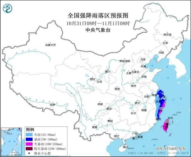 預計,10月31日08時至11月1日08時,福建東北部、浙江中東部、上海、江蘇南部等地有暴雨,其中,福建東北部、浙江東部等地的部分地區有大暴雨(100-220毫米);台灣島有大暴雨,台灣島東部的部分地區有特大暴雨(250-800毫米),與歷史同期相比,上述地區降水具有極端性。