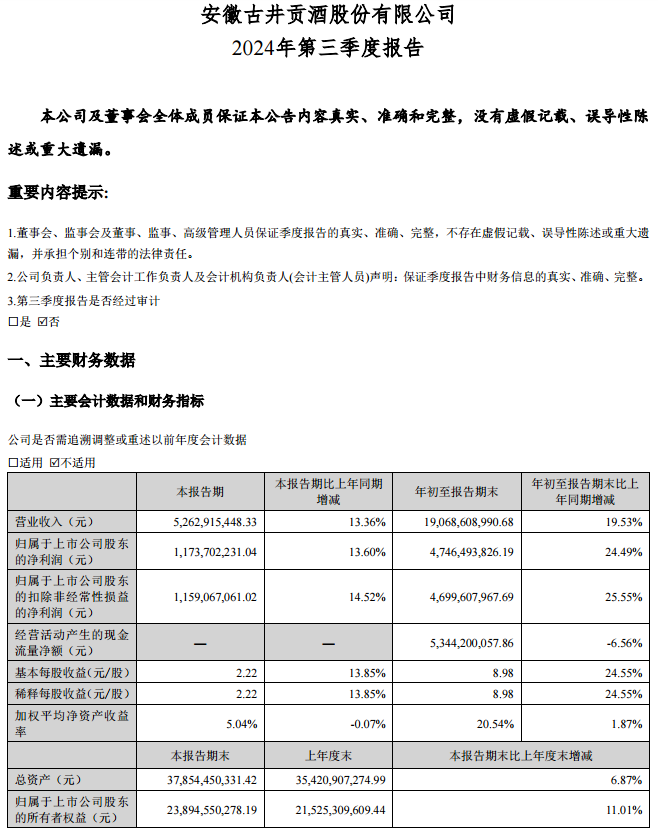 截至三季度末,古井貢酒的總資產為378.54億元,較上年度末增長6.9%;歸母淨資產為238.95億元,較上年度末增長11.0%。