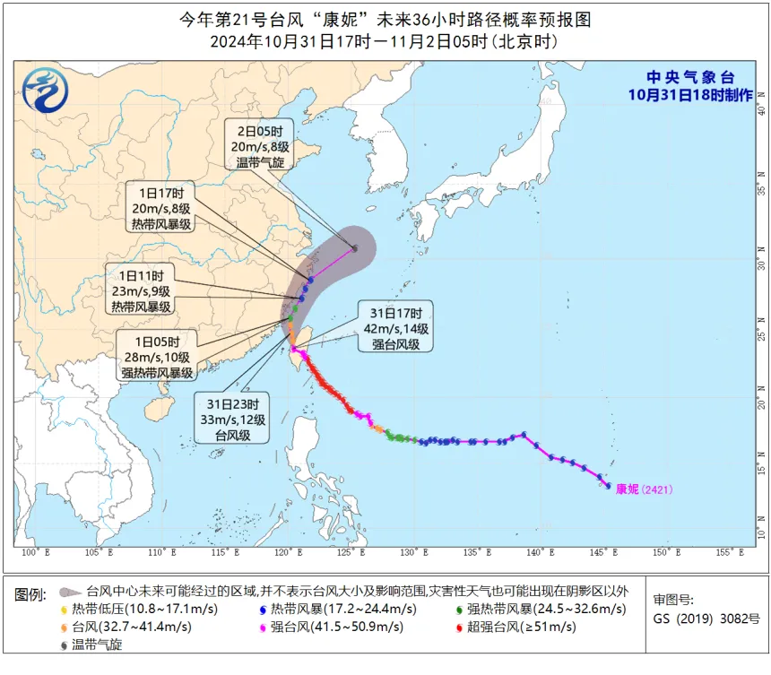 今年第21號颱風“康妮”的中心已於10月31日14時前後在台灣省台東縣成功鎮沿海登陸,登陸時由超強颱風級減弱為強颱風級,*中心附近最大風力有15級(48米/秒),中心最低氣壓945百帕。*今天夜間進入台灣海峽,給浙江省帶來較大風雨影響,寧波將迎來暴雨到大暴雨天氣。