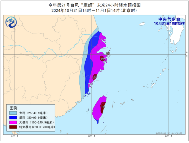 據中央氣象台,預計10月31日14時至11月1日14時,福建東北部、浙江中東部、上海、江蘇南部等地有暴雨或大暴雨,其中,福建東北部、浙江東部等地局地有特大暴雨(250-300毫米);台灣島有大暴雨,其中台灣島東部局地有特大暴雨(250-700毫米)。