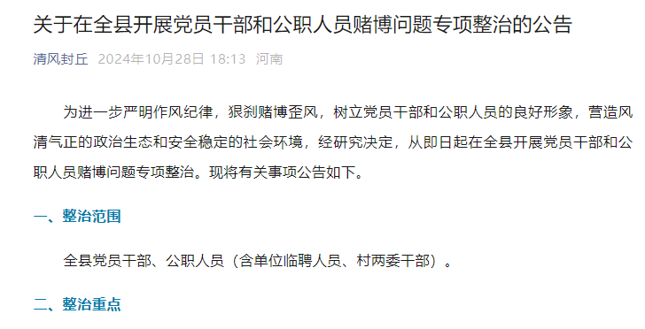 河南封丘縣紀委監委同日還發布公告,在全縣開展黨員幹部和公職人員賭博問題專項整治,並公佈了舉報方式。