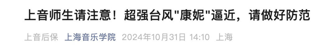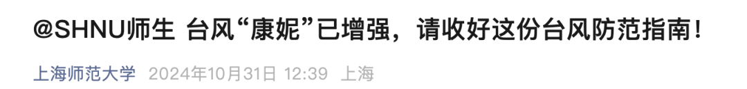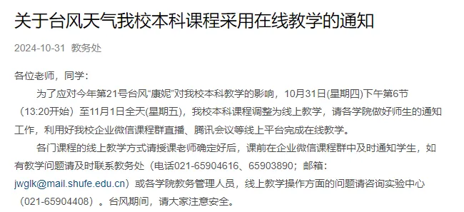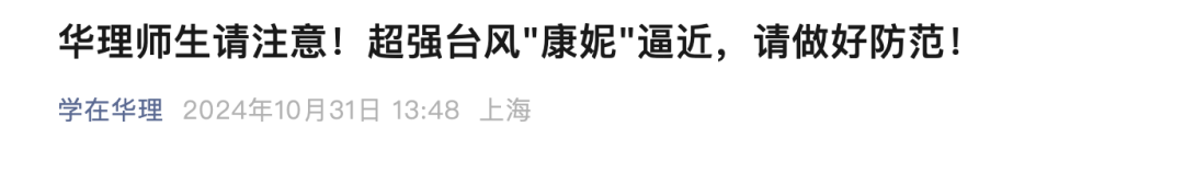 上海師範大學多位學生也表示,學校通知學生,10月31日(星期四)下午第6節課至11月1日全天(星期五),上海師範大學兩校區的課程*調整為線上教學,*請同學們颱風天注意安全。
