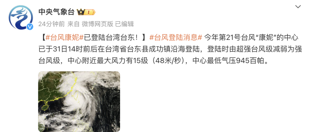 據央視新聞消息,全台22個縣市全部停班停課,相關部門呼籲民眾不要外出,注意安全。