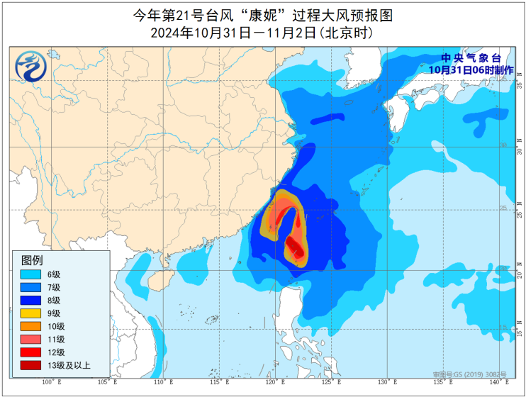 大風預報:31日至11月2日,受冷空氣和“康妮”的共同影響,黃海南部、東海大部及釣魚島附近海域、台灣海峽、台灣以東洋麪、巴士海峽、南海北部及東沙羣島附近海域、浙江沿海、福建沿海、台灣島沿海有7~9級大風,陣風10~11級;台灣海峽、台灣以東洋麪和巴士海峽部分海域、台灣島東部沿海、福建中部沿海風力有11~12級,陣風13~14級,颱風中心經過的附近海面風力有13~16級,陣風17級及以上。