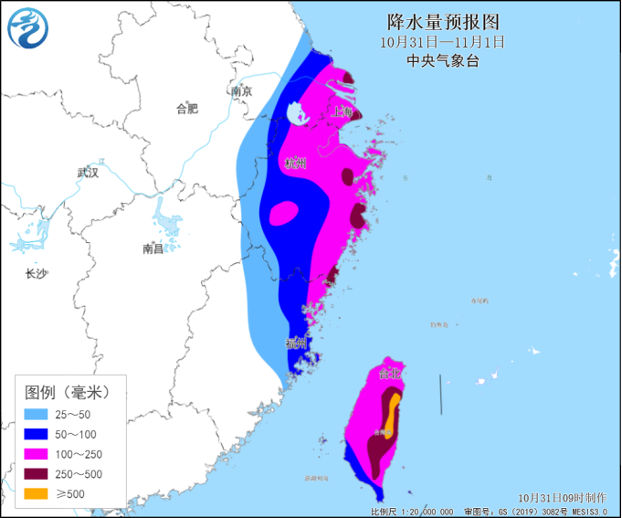 *降雨預報:*31日至11月1日,台灣島、福建東北部、浙江中東部、上海、江蘇南部等地有暴雨,部分地區大暴雨(累計降雨量100~200毫米),台灣島東部、福建東北部、浙江東部、上海東南部等地局地有特大暴雨(降雨量250~400毫米,台灣島東部400~800毫米);最大小時降雨量40~70毫米,台灣島局地80毫米以上。