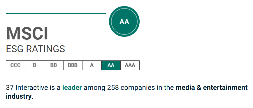 作為A股上市公司中MSCI ESG評級表現領先的企業代表,三七互娛近年來的ESG治理工作獲得多方認可。自2018年首次被納入MSCI ESG評價體系,三七互娛在五年內實現了從B級到AA級的五級跨越,並在2024年保持AA級,表現領先全球傳媒娛樂行業同業。其中,三七互娛在“碳排放管理”、“隱私及數據安全”,以及“企業治理”方面均處在行業領先水平。在標普CSA可持續發展評分中,三七互娛亦位列全球同業表現前4%分位,併成功入選標普全球《可持續發展年鑑(中國版)2024》。