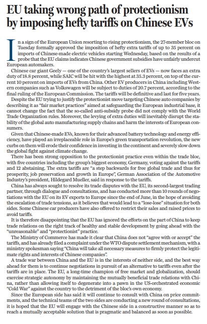 原標題:EU taking wrong path of protectionism by imposing hefty tariffs on Chinese EVs