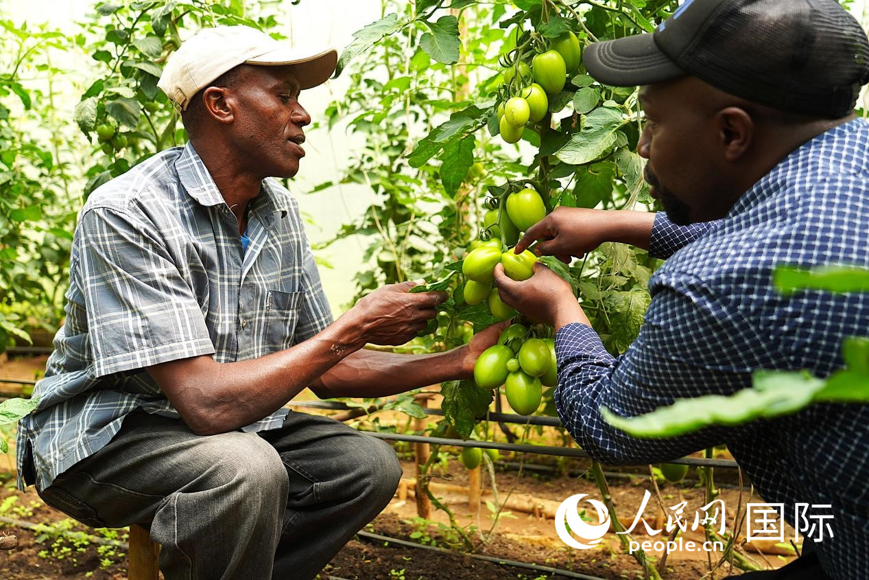 肯尼亞納庫魯郡,埃格頓大學園藝學專家史蒂芬·吉藤古在温室大棚裏指導當地農民喬納·卡蘭賈種植番茄。人民網記者 黃煒鑫攝