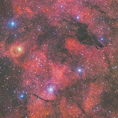 黑狼星雲之所以能在星空中顯形,是因為它與周圍明亮的星雲形成了鮮明對比。這張照片以驚人的細節展現了這隻“狼”如何從其後方那些正經歷着恆星形成的輝光雲層中脱穎而出。那些五彩繽紛的雲朵主要是由氫氣構成,並受到新生恆星強烈紫外線輻射的影響而呈現出紅色。