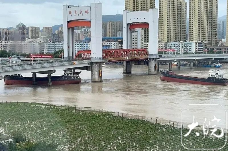 多段視頻顯示,一處大橋下方的水面上,兩艘船停靠在橋面下方的柱子邊,橋體寫着“甌南大橋”字樣。另一段視頻中,有民警在路面拉起警戒線,視頻中傳來有男子説“甌南大橋斷了,大家小心”的話語。