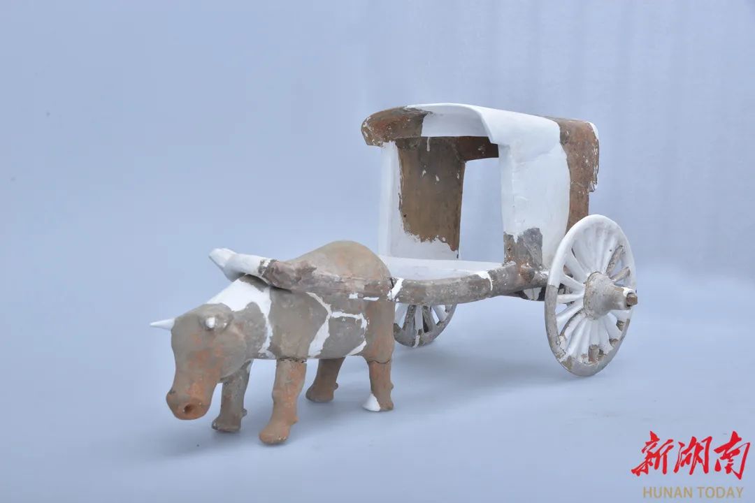 這在長沙東晉墓及其他六朝墓多有體現,陶俑中出現了各式牛車。桂花坪東晉墓發現一套陶牛車,車長61.5釐米、高31.6釐米,由牛、車廂、轅、車軸和車輪拼接而成,車廂有頂蓋,廂門開於後方,車輪18根輻條。牛的長度35.7釐米、高度17.6釐米,肌肉線條刻劃有力。
